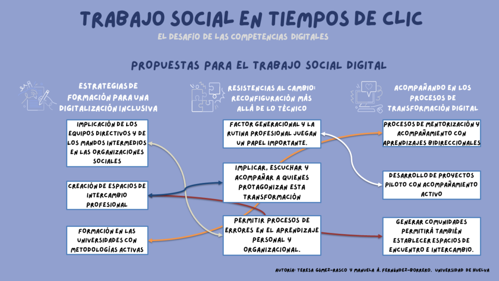 En definitiva, avanzar hacia una verdadera transformación digital en los Servicios Sociales requiere mucho más que tecnología: exige escuchar al equipo profesional, reconocer su saber experto y promover una digitalización justa, ética y situada que no desdibuje el vínculo social, sino que lo potencie. A la par, requiere un trabajo organizacional y de apuesta política que acompañe y atraviese estos procesos. Para lograrlo, es imprescindible incorporar la formación como eje estratégico desde el ámbito universitario hasta el desarrollo profesional continuo, generar espacios de participación en el diseño de los procesos y abordar las resistencias legítimas que surgen ante el cambio. Solo así será posible construir una transformación digital que no sea impuesta, sino compartida, reflexiva y orientada al bienestar colectivo. Proyectos piloto innovadores con acompañamiento pueden ser la vía para ensayar, aprender y avanzar.